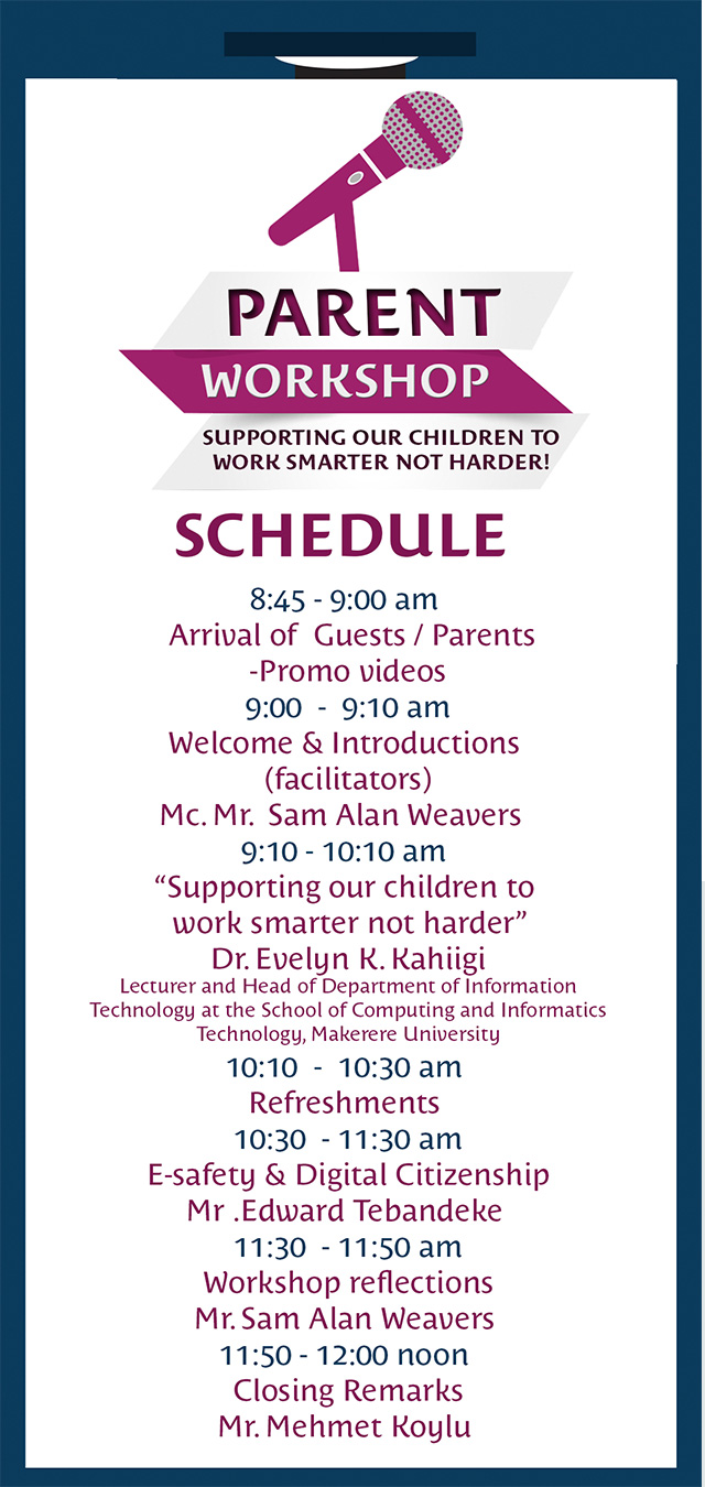 Dear, Parents/Guardians you are warmly invited to our upcoming all Parents workshop which will be held at the school on Saturday,9th December, 2017, 9:00am–12:00 noon on the theme: “Supporting our Children to work smarter and not harder!